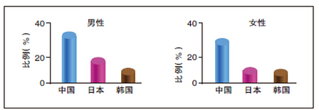 对于同等条件的女性,日本人为3%,中国人为33%,中国是日本的10倍。如果吸烟的话,日本人是6%,中国人是58%,差不多也是10倍。