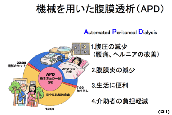 腹膜透析(腹膜透析:PD)进行的每日4次的透析液的交换,但CAPD用于透析液储存24小时腹腔(腹膜透析)已经开展了,近年来使用机并且,它也已进行了APD的治疗更换透析液(自动腹膜透析),而自动进入睡眠状态(参见图1)。