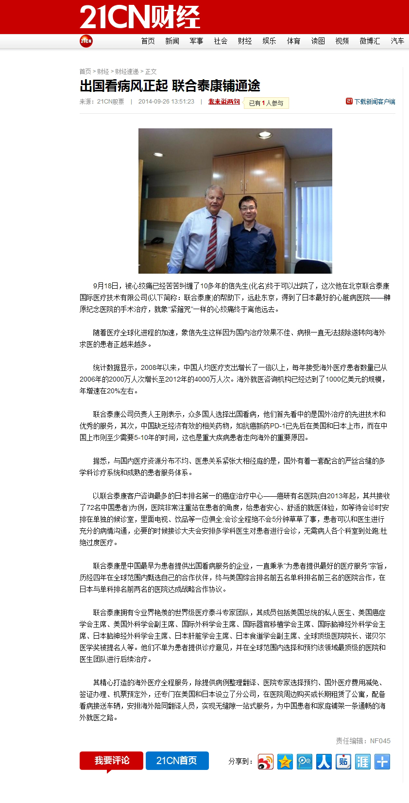 21CN财经:出国看病风正起 hopenoah铺通途