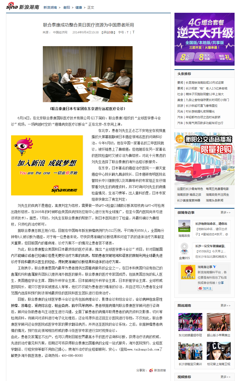 新浪网:hopenoah成功整合美日医疗资源为中国患者所用