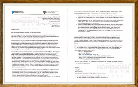 ▲2017年 10月30日,厚朴方舟国际患者转诊地位得到了麻省总医院的正式认可
