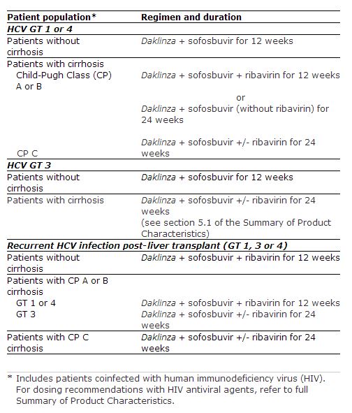 此次新适应症的批准,是基于ALLY-1临床研究(移植后丙肝患者和晚期肝硬化丙肝患者)和ALLY-2临床研究(HIV/HCV共感染患者)的积极顶线数据。介绍的治疗方案和治疗持续时间如下: