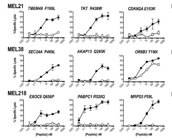 (黑色圆点为对肿瘤抗原的辨识率,白色圆点为对野生蛋白的辨识率。可以明显看出针对肿瘤抗原的辨识存在特异性)