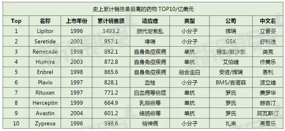 前列,适应症必须是常见的病,像立普妥主要治疗高血脂,修美乐治疗类风湿性关节炎,当然也少不了癌症药物,罗氏的癌症药物三巨头悉数入围。