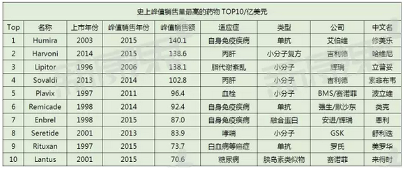 榜单中以单抗为代表的生物类药物占据了六席,在重磅炸弹中生物药已经领头于化学药了。这其中自然不得不提艾伯维的修美乐,虽然它现在只在榜单中排名第四,不过5年后再来一次排名,很有可能超越立普妥位居榜首。在这些药物中,它上市较晚,而且现在仍然保持着强劲的增长势头,2015年销售额超过了140亿美元,2016年上半年已经销售了77亿美元,说明它还远远没有达到销售峰值,预测100 亿美元以上的年销售额至少还能维持5年。