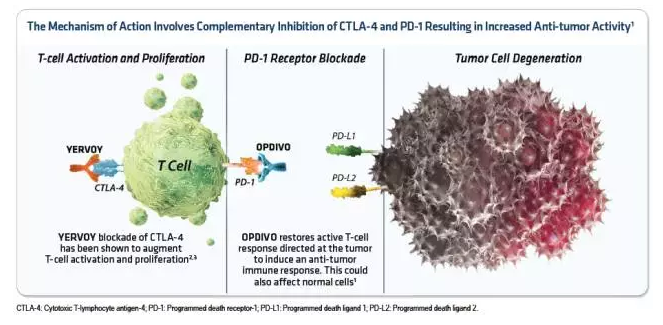 某些癌症的难治性也可归根于肿瘤细胞可以“利用”免疫检查点机理“隐身”起来,逃避免疫系统免受攻击。纳武单抗和YERVOY是分别靶向不同且互补的免疫检查点通路(PD-1和CTLA-4)的有效抑制剂。双重抑制免疫检查点的机制有望增强身体的免疫抗肿瘤活性。YERVOY旨在阻断CTLA-4来增强T细胞活化和增殖,而纳武单抗可恢复T细胞针对肿瘤的活性应答。
