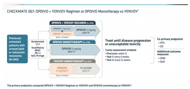 该项前沿批准基于来自关键性临床研究CheckMate-067的良好数据,在不可切除型或转移性黑素瘤的初治病人群体中评估了纳武单抗+YERVOY组合治疗方法、纳武单抗单药治疗方法相对于YERVOY单药治疗方法的无进展生存期和总生存期。总体反应率是次要目标。