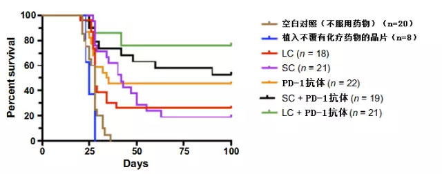 在化疗也进行了两周后,研究人员从小鼠的淋巴腺、脑、骨髓中抽取了血样,对T细胞的数量进行了统计,这是衡量免疫系统完整性的一个重要指标。结果显示,SC组小鼠的T细胞数量明显较低,仅为LC组的1/3!研究人员说,这与临床上接受全身化疗的患者的情况是相符的。接下来,研究人员又比较了不同治疗方法下小鼠的生存率。在治疗结束后的100天LC组小鼠约有80%存活,而SC组为50%,单独使用PD-1免疫治疗方法方法组则只有40%多。