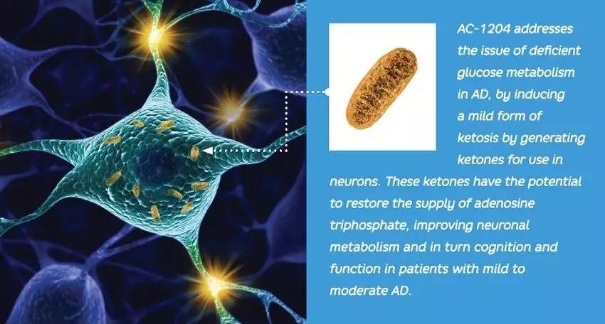 由雀巢公司投资的Accera将阿兹海默病当作一种新陈代谢失调的疾病来看待。它的药物AC-1204在患者体内产生酮体供神经细胞使用,以缓解因阿兹海默病患者脑部葡萄糖供应不足造成的神经细胞能量短缺的问题,通过改善神经细胞的新陈代谢以增进患者的认知功能。AC-1204的前列项3期临床试验预计将在今年3月公布数据。