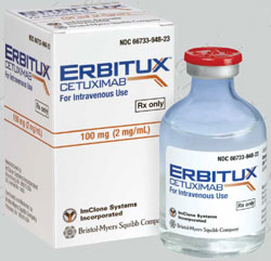 西妥昔单抗(Erbitux ®)是一种针对表皮生长因子受体(EGFR)的单克隆抗体(人造型的免疫系统蛋白),这是一些能够帮助它们生长和分裂的细胞表面的蛋白质。喉癌和下咽癌细胞经常具有超过正常量的EGFR。通过阻断EGFR,西妥昔单抗可以减慢或停止细胞生长。