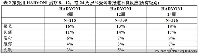 Harvoni的不受威胁性评估是根据来自三项3期临床试验有基因型1慢性丙肝(CHC)与代偿肝病(有和无肝硬化)受试者包括接受Harvoni共8、12和24周分别215、539和326例受试者的合并数据。对受试者接受Harvoni共 8、12和24周由于不良事件长久地终止治疗受试者的比例分别为0%、<1%和1%。用8、12或24周Harvoni治疗受试者较常见不良反应(≥10%)为疲乏和头痛。