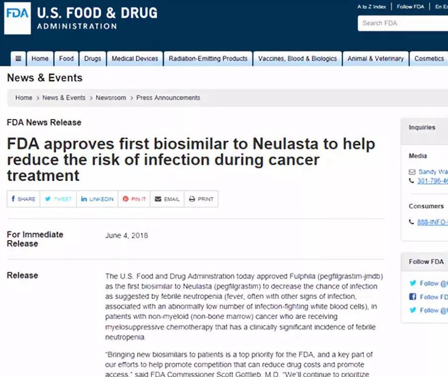 海外癌症新药: 升白针生物仿制药“Fulphila”获批准