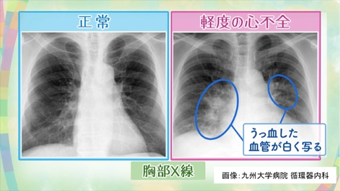 上面为胸部X射线图像。在正常情况下,肺部应呈黑色。但有心功能不全患者(即使是轻度),会因肺部淤血而使肺局部血管变粗,从而在影像上,局部肺呈白色状态。