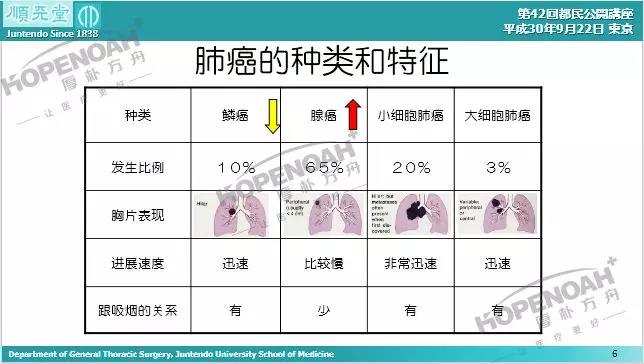 铃木教授介绍,肺癌分四种:腺癌、鳞癌、小细胞癌、大细胞癌。其中,与吸烟有着密切关系的是鳞癌,由于大多数鳞癌都为中心型,容易早期出现咳嗽、血痰等症状,且疾病进展迅速,是容易早期发现的癌症。腺癌一般好发于肺外周,与鳞癌不同的是,腺癌症状隐匿,进展速度相对较慢,因此需要大家密切关注,定期做痰液和CT检查(X光不能发现肺腺癌)。