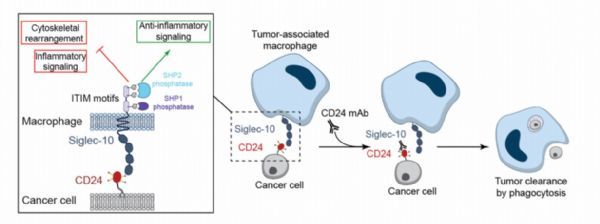 筛选的结果,让研究人员们找到了一种叫做CD24的蛋白分子。他们指出,出现在肿瘤部位的巨噬细胞上,带有一种叫做Siglec-10的受体。它能识别癌细胞的CD24,从而让巨噬细胞“胃口大减”,对癌细胞提不起食欲。