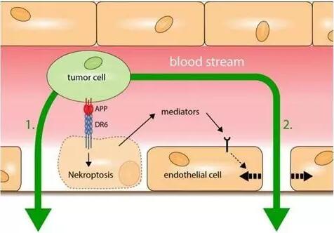 研究人员也发现血管内皮细胞自身也释放出宣告它们自己死亡的信号:这些血管壁细胞(即血管内皮细胞)在它们的表面上含有受体分子DR6。Strilic解释道,“当癌细胞与DR6接触时,癌细胞表面上的蛋白APP激活它。这标志着癌细胞开始攻击血管壁,较终导致血管壁细胞发生坏死性凋亡。”