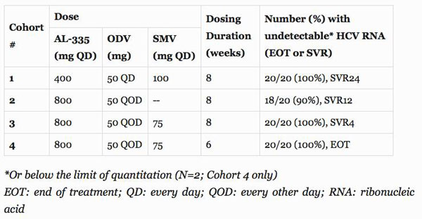 数据表明,该三重组合方案针对非肝硬化1型HCV感染患者是非常有效的,耐受性良好。AL-335是一类丙肝病毒NS5B核苷酸聚合酶抑制剂,odalasvir是丙肝病毒NS5A抑制剂,而simeprevir是丙肝病毒NS3/4A蛋白酶抑制剂。