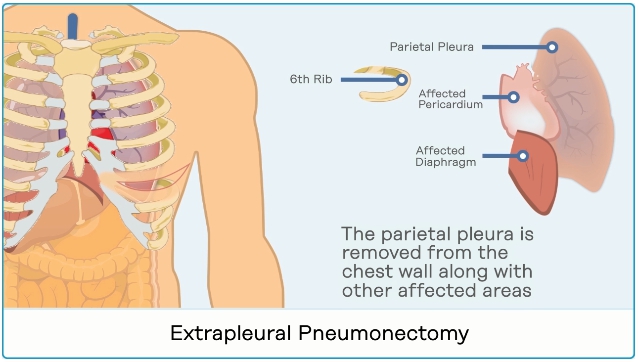 早期恶性胸膜间皮瘤患者,可以进行根治性外科手术切除肿瘤。通常手术前后会进行化学治疗作为辅助治疗方案。胸膜外肺切除术(EPP)是恶性胸膜间皮瘤的常见手术方法。胸膜切除术联合胸膜剥脱术是早期胸膜间皮瘤的有效手术方式,手术只需要切除病变的胸膜,而尽量保留肺部。如果癌症已经扩散到胸膜外,那么需要进行扩大胸膜切除术联合胸膜剥脱术。