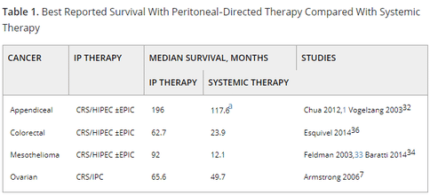 《临床医生癌症杂志》(CA: A Cancer Journal for Clinicians)于2015年5月发表的一篇文章对CRS/HIPEC治疗腹膜癌的进展进行了综述:
