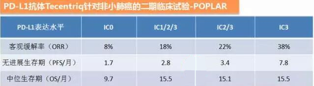 值得注意的是:这个临床结果发现无论PD-L1表达状态如何,使用Tecentriq都会比使用多西他赛的患者OS更长。之前就 有Tecentriq针对非小肺癌的二期临床POPLAR 研究,发现PD-L1表达量越高,Tecentriq的效果越好。IC0代表PD-L1阴性,IC1/2/3代表PD-L1阳性,IC3是强阳性。具体的 临床数据如下: