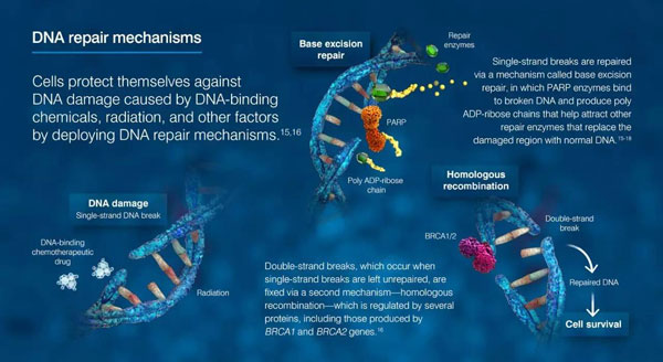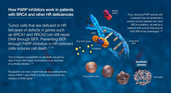 Clovis公司开发的rucaparib是一种抑制PARP1、PARP2和PARP3功能的口服小分子抑制剂。PARP蛋白的功能是启动细胞内DNA修复机制来修复DNA受到的损伤。人体细胞中的DNA会由于受到不同环境因素的攻击而产生DNA损伤,如果这些损伤得不到修复,积累到一定程度时会引发细胞凋亡。BRCA基因编码蛋白的功能是通过另外一条途径修复DNA损伤。PARP和BRCA蛋白在修复DNA损伤的过程中可以起到互补的作用。而在携带BRCA基因突变的卵巢癌细胞中,由BRCA蛋白媒介的DNA损伤修复机制已经遭到破坏,如果同时抑制PARP引导的DNA修复机制,癌细胞将非常容易积累DNA损伤,从而导致细胞凋亡。这就是rucaparib杀伤癌细胞的作用机理。