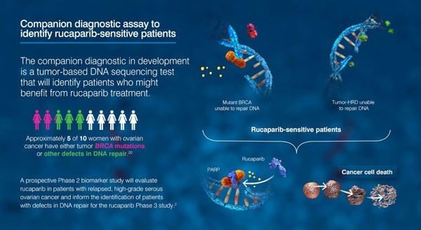 Rucaparib的作用机理也意味着需要有伴随诊断(Companion Diagnostics)测试来发现那些携带有BRCA基因突变,较可能对rucaparib治疗方法产生反应的患者。为此,Clovis公司与药明康德合作伙伴Foundation Medicine公司合作开发了名为CDXBRCA的伴随诊断测试。Foundation Medicine于今年6月向FDA递交了这项伴随诊断测试的上市前批准申请(Premarket Approval Application,PMA)。这样rucaparib这一个体化治疗方法与它的伴随诊断可能在接近的时间段获得FDA的批准。