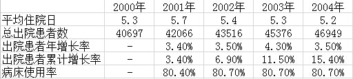 表1:耶鲁纽黑文医院2000 – 2004年累计患者出院数量,平均住院日,病床使用率