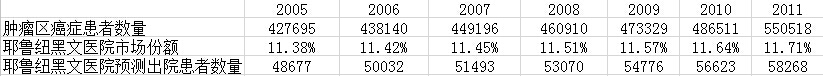 根据服务区内癌症患者数量的增长,以及耶鲁纽黑文医院市场份额的增长,医院可以预测2005年到2011年出院患者数量。这些预测的数据可以为“内部增长模型”预测结果提供确认和验证。