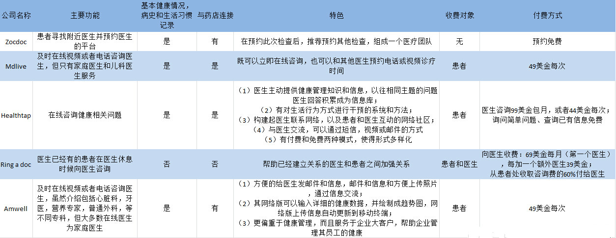 5家公司有很多方面有相似的共性,例如都试图尽可能多、而且可靠数据的搜集患者健康情况、病史和生活习惯等数据,都试图与药店进行网上的连接,可以直接把电子处方发到药店。我们把5个公司的模式进行总结和比较: