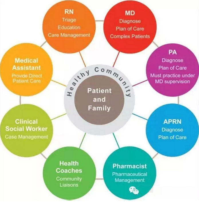 在美国的医院,每一个患者入院后都会有针对其疾病的医疗团队为他提供全方位的医疗和护理。团队治疗在中国又称为序列治疗。一般来讲一个医疗团队包括:一到多个相关专科医师(Medical Doctor ,MD),负责疾病诊断、制定治疗计划、患者综合治疗;专科医师助理(Physician Assistant ,PA),负责在专科医师的指导下辅助诊断、制定治疗计划;助理医师(Medical Assistant);vip职业护士(Advanced-practice Registered Nurse ,APRN)和注册护士(Registered,Nurse),负责患者的基本护理;药剂师(Pharmcist),负责患者用药;病愈医师(Health Coaches ,HC),负责加强病后术后保健;服务社工(Clinical Social Worker ,CSW),为患者及家属提供医疗和生活资讯。为使团队能够高效的为患者服务,医疗团队有五大原则:1)团队的目标一致;2)成员职责明确;3)互相信任;4)有效沟通;5)可评估的质量监测。缺一不可。