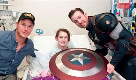 大度的埃文斯近日身着“美国队长”服装,手拿盾牌和帕拉特惊喜现身西雅图儿童医院。
