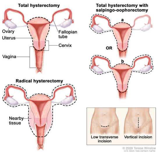 子宫切除术。子宫手术切除有或没有其他器官或组织。在全子宫切除术中,子宫和子宫颈被移除。在全子宫切除术中,输卵管卵巢切除术(a)子宫加一个(单侧)卵巢和输卵管被移除; 或(b)子宫加双侧(双侧)卵巢和输卵管被移除。在根治性子宫切除术中,子宫,子宫颈,两个卵巢,输卵管和附近的组织都被移除。这些手术使用低横切口或垂直切口完成。