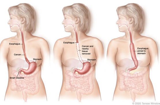手术通常包括切除带有癌症的食道部分,以及癌周围的少量组织,以及附近的淋巴结。在这个手术过程中,被称为食管切除术,食管的一部分被移除,胃被拉起并与剩下的食管连接。