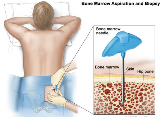 骨髓穿刺和活检。在小面积皮肤麻木后,将骨髓针插入患者的髋骨。在显微镜下取出血液,骨头和骨髓样本进行检查。
