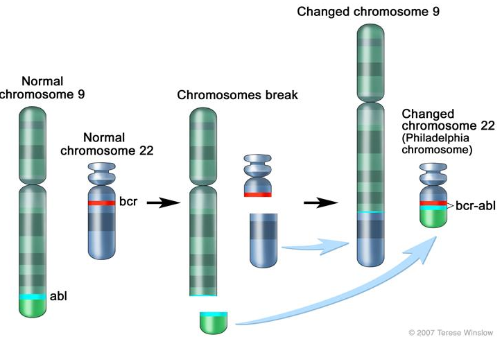 费城染色体。一条染色体9和一条22号染色体脱落并交换位置。bcr-abl基因在染色体22上形成,其中染色体9片段附着。改变后的染色体22被称为费城染色体。