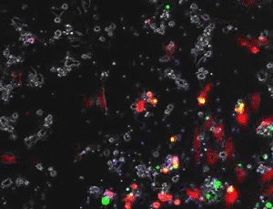 ▲随着癌细胞开始裂解,BiTE会得到释放,让T细胞攻击成纤维细胞(红色),杀死后者(绿色荧光)