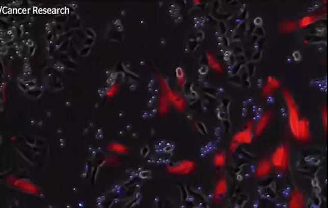 ▲癌细胞(黑色)的周围有大量成纤维细胞(红色)。它们起到了保护作用