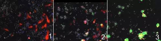 改造病毒,让受感染的癌细胞能表达这种BiTE接头,在溶瘤病毒的作用下,癌细胞(黑色)开始死亡(绿色荧光),而成纤维细胞(红色)暂时不受溶瘤病毒的直接影响。