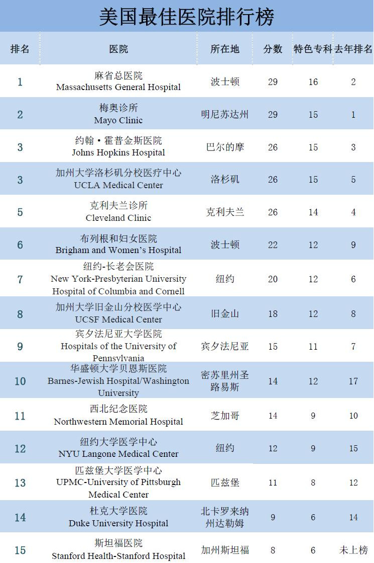 7月21日《美国新闻与世界报道》公布了美国2015-2016权威医院排名,今年共有15家医院登上荣誉榜。其中麻省总医院以29分和16个特色专科排名前列,而去年排在前列位的美国权威M医院则紧跟其后排名第二。约翰·霍普金斯医院和加州大学洛杉矶分校医学中心并列第三。今年的榜单中出现了两匹黑马,一个是华盛顿大学贝恩斯医院,从去年的17为跃居到第10位。另一个则是今年新上榜的斯坦福医院,排在第15位。下图为美国2015-2016权威医院排行榜详情: