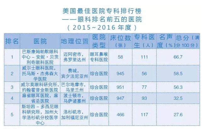 在2015~2016年度全美权威医院的16个专科排行榜中,眼科、精神科、病愈科和风湿科的排名依据是对该专科领域内专家在近三年内进行的医院名声调查。