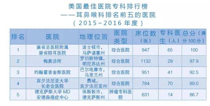 在耳鼻喉专科领域,《美国新闻与世界报道》列出了738家医院的信息,这些医院在2011~2013年期间至少治疗过25名疑难重症的耳鼻喉住院患者,其中得分较高的50家医院成功上榜。