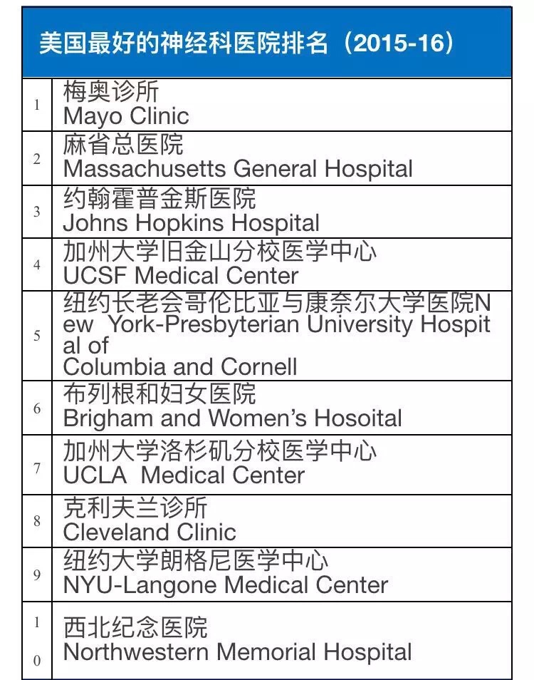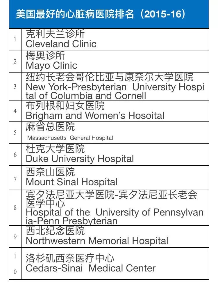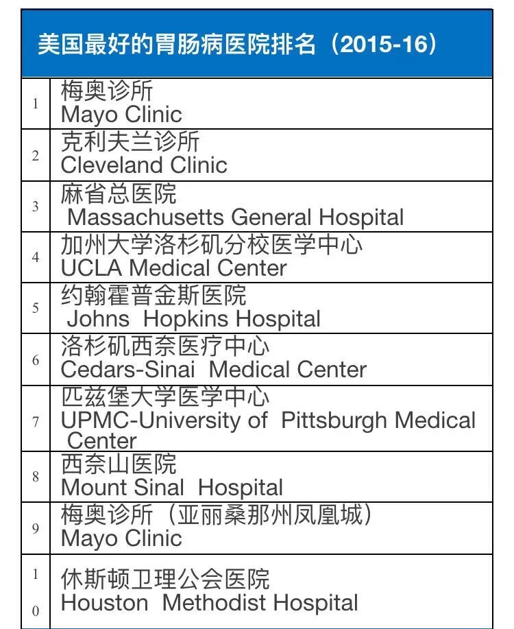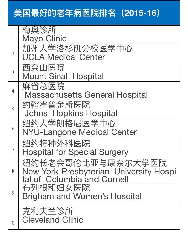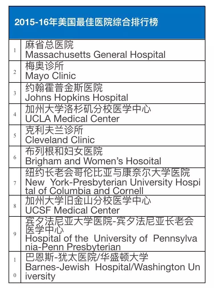 2015-16美国权威医院综合排行榜及16项专科排行榜