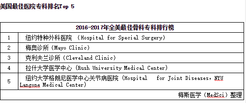 出国看病:2016-2017年全美权威骨科专科医院排行榜