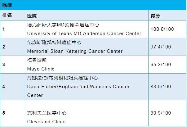 美国优质医院专科排名Top 5