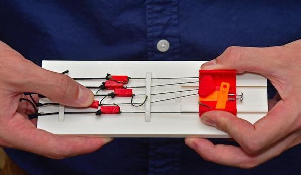 不过,TOIL研究团队发展,当前的这种3D打印假手设计具有一定的局限性。比如如果有一根手指受到阻碍,就会导致所有的手指无法活动,这就限制了抓握能力。为此,研究人员希望能够开发出新的设计,使每根手指能够独立活动,这就有助于改进其抓握能力和灵活性。那么,他们的解决方案是什么?“Whippletree”,这是一个聪明的结构,它由一个中央节点和到其它几个联动结构的连接组成。当Whippletree的一个连接受到阻挡之后,其中央节点会移动,并通过每个链接将力量均匀地发布出去。据悉,一个e-NABLE的3D打印假手设计上可以使用一个whippletree,使每根手指都能够独立运动,这样用户可以牢牢抓住几乎任何形状的对象。