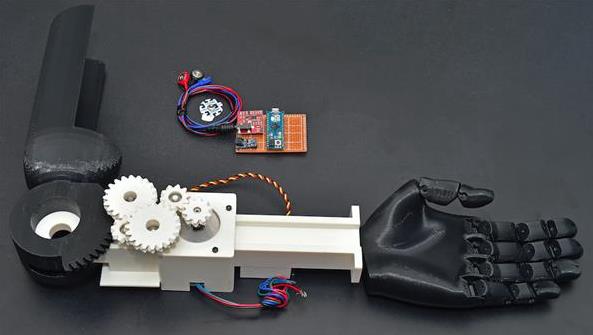 出了这些常见的3D打印假手之外,TOIL团队还花功夫为那些使用电机的假手设计出了更坚固的结构。这些假手主要是为那些没有手腕、甚至手臂的人设计的。使用3D打印的齿轮加上马达和Arduino,研究人员创建出了可以通过肌肉传感器来控制的3D打印假臂,其制造成本大约在350美元左右,而且能够与e-NABLE假手兼容。这种使用了电机的手臂(见下图)可以举起大约25磅的重量,不过该团队目前正在测试3D打印塑料零件的举重能力。