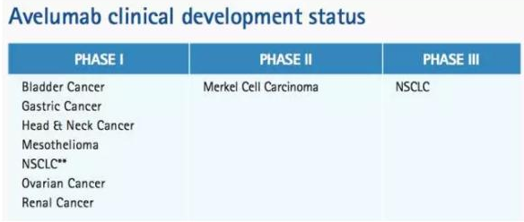 Avelumab的临床开发项目JAVELIN涉及至少30个临床研究,在3000多名患者中评估15多种不同的肿瘤类型。除了转移性MCC,JAVELIN临床研究还涉及了乳腺癌、胃/胃食管连接癌、头颈部癌、霍奇金淋巴瘤、黑素瘤、间皮瘤、非小细胞肺癌、卵巢癌、肾细胞癌和尿路上皮癌等其他癌症。