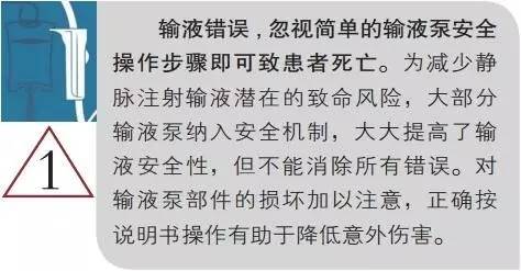 对于忽略输液泵不受威胁操作步骤可致患者死亡的风险,如果对输液泵部件的损坏加以注意,正确按说明书操作有助于降低意外伤害。