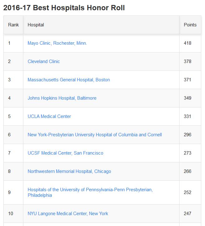 出国看病服务机构厚朴方舟得知,就在8月1日,US news推出了2016~2017年的美国医院排名指南!全美国满意质的医院资源,尽在这个榜单。我们就一起来看看这个榜单吧!