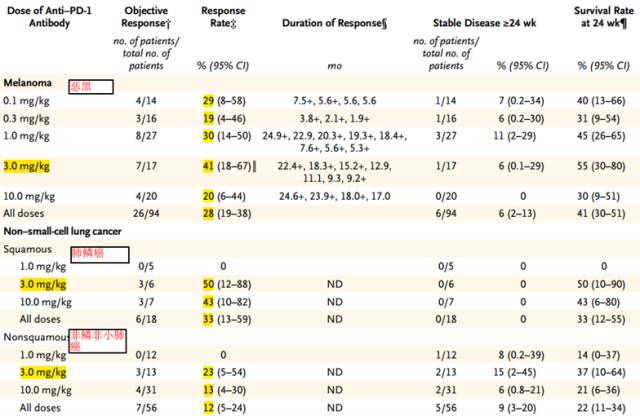 国内肿瘤患者已经很不容易,经济压力很大,不是每个家庭都可以拿得出一年50万人民币来使用这个神药的。趁着这个剂量调整的消息,下面给大家总结一些PD-1抗体的早期临床数据,帮助大家判断剂量和效果的关系,见仁见智。
